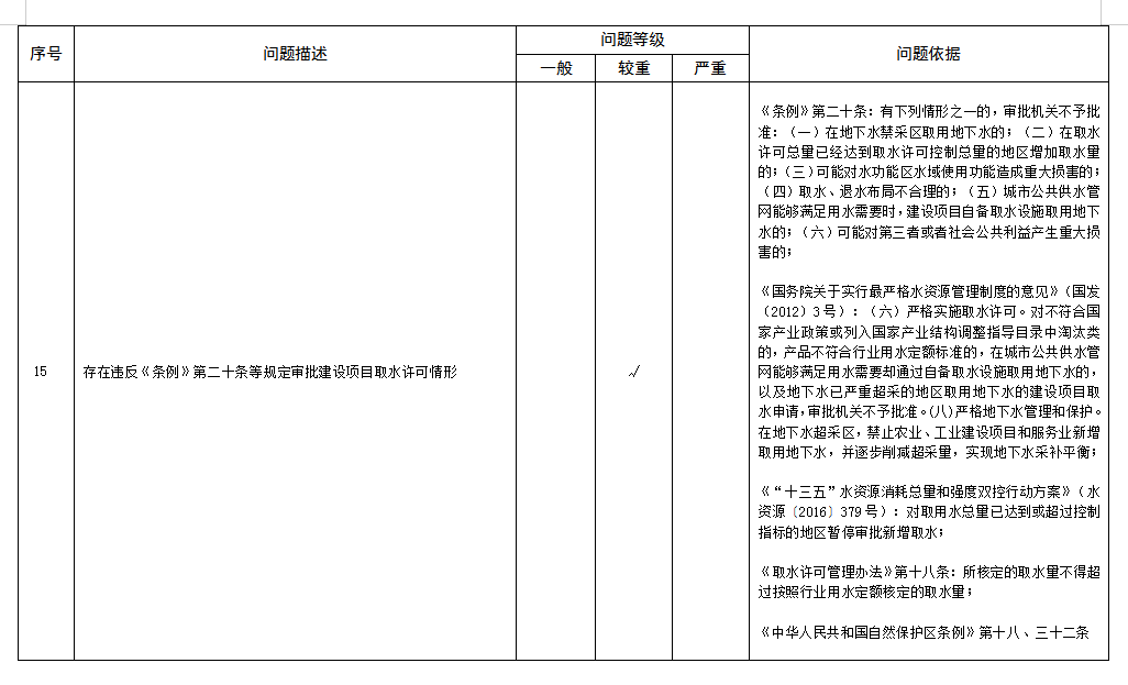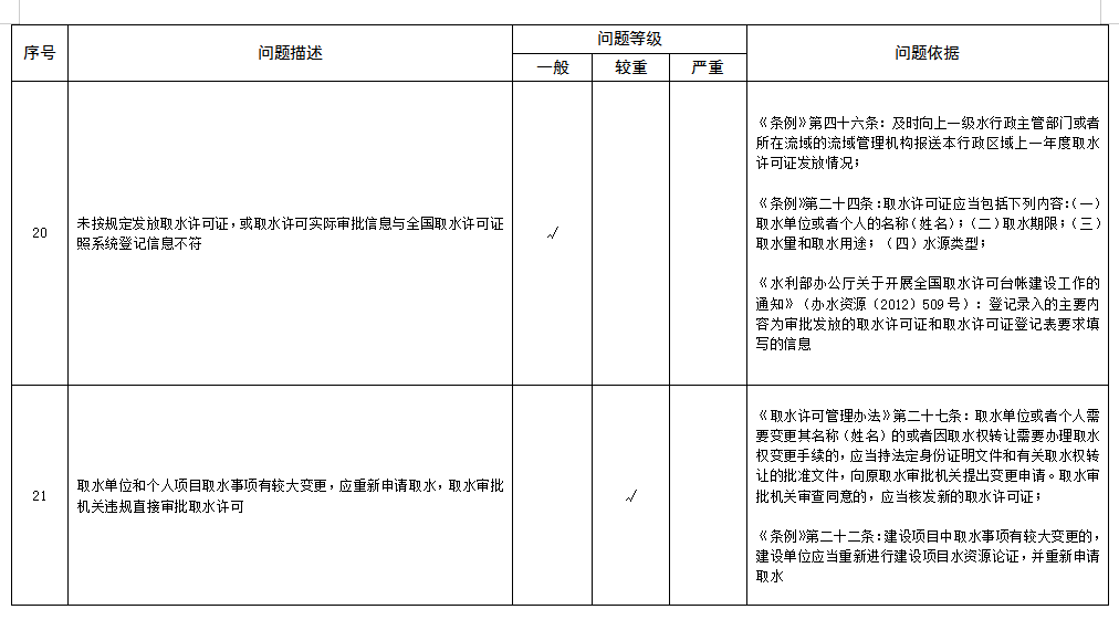 水资源管理监督检查依据相关法律法规、相关工作程序,认定违反水资源管理法律法规方面的问题。
